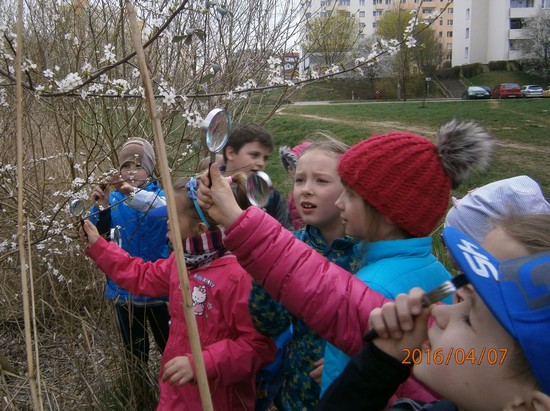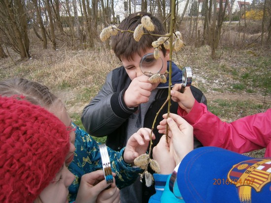 Monika zaobserwowała jak sroki budują gniazda na drzewach. Tosia razem z koleżanką Mają mierzyły obwód drzewa, a Filip i Franek obserwowali przez lupę korę drzewa. Julka znalazła kwitnące fiołki.